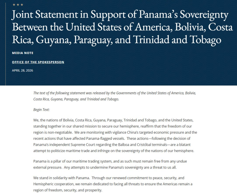 बोलिभिया, कोस्टा रिका, गुयाना, पाराग्वे, त्रिनिदाद एण्ड टोबागो र संयुक्त राज्य अमेरिकाले सामूहिक रूपमा चीनको “लक्षित आर्थिक दबाब” को कडा निन्दा गरेका छन्। यो विज्ञप्तिले विशेष गरी पनामाको झण्डावाहक जहाजहरूमाथि पछिल्लो समय चीनले गरिरहेको व्यवहारलाई मुख्य मुद्दा बनाएको छ।