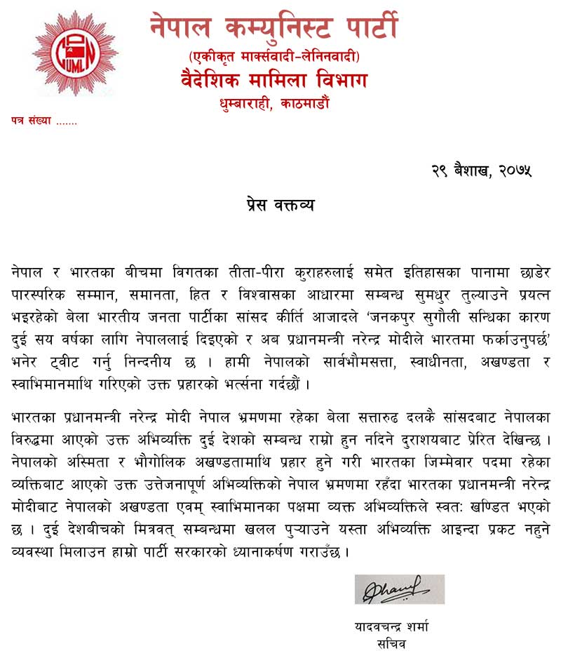 भारतीय प्रधानमन्त्री नरेन्द्र मोदी नेपाल भ्रमणमा रहेकै बेला भाजपा सांसद आजादले ‘जनकपुर सुगौली सन्धिका कारण दुई सय वर्षका लागि नेपाललाई दिइएको र अब प्रधानमन्त्री नरेन्द्र मोदीले भारतमा फर्काउनुपर्छ’ भनेर ट्वीट गरेका थिए ।मोदी नेपाल भ्रमणमा रहेका बेला सत्तारुढ दलकै सांसदबाट नेपालका विरुद्धमा आएको उक्त अभिव्यक्ति दुई देशको सम्बन्ध राम्रो हुन नदिने दुराशयबाट प्रेरित देखिएको एमालेले जनाएको छ । दुई देशबीचको मित्रवत् सम्बन्धमा खलल पुर्याउने यस्ता अभिव्यक्ति आइन्दा प्रकट नहुने व्यवस्था मिलाउन एमालेले सरकारको ध्यानाकर्षण गराएको छ ।