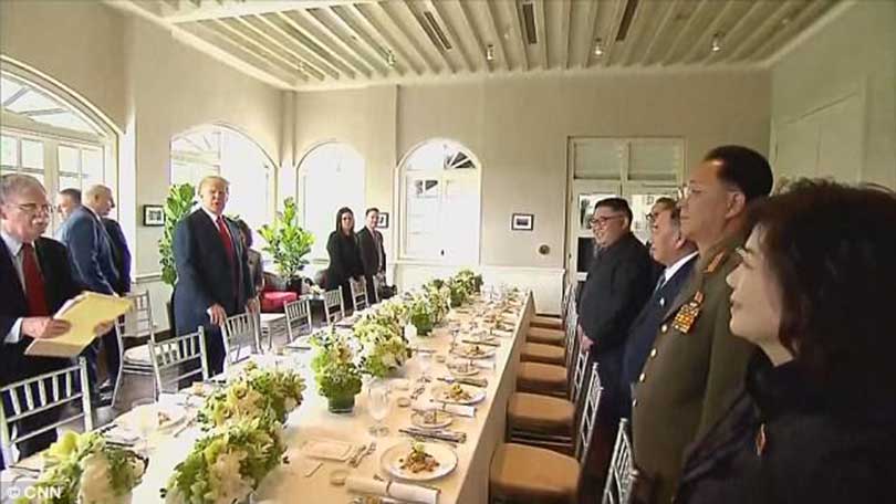 सुरुमा उनीहरुलाई विशेषगरी मलाय प्रायद्वीपमा लोकपि्रय हरियो आँपबाट बन्ने ‘केराबु’ मा मह र ताजा अक्टोपस राखी सर्भ गरिएको थियो । त्यस्तै काँक्रोमा अरु विभिन्न चिज राखेर बनाइने कोरियाली खाना ‘ओइजोन’ को साथमा एभोकाडोको सलादसँग प्राउन ककटेल ट्रम्प र किमले खाए ।