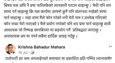 काठमाडौं १८ साउन । संवैधानिक परिषद्को बैठकले विश्वम्भरप्रसाद श्रेष्ठलाई प्रधानन्यायाधीशमा सिफारिस गरेको छ। बिहीबार साँझ बसेको बैठकले उनको नाम सिफारिस गरेको राष्ट्रिय सभा अध्यक्ष गणेशप्रसाद तिमल्सिनाले जानकारी दिए। गत असार १ गते नियुक्त प्रधानन्यायाधीश हरिकृष्ण कार्कीको पदावधि यही साउन २० गते सकिँदै छ। अघिल्लो प्रधानन्यायाधीशको ...