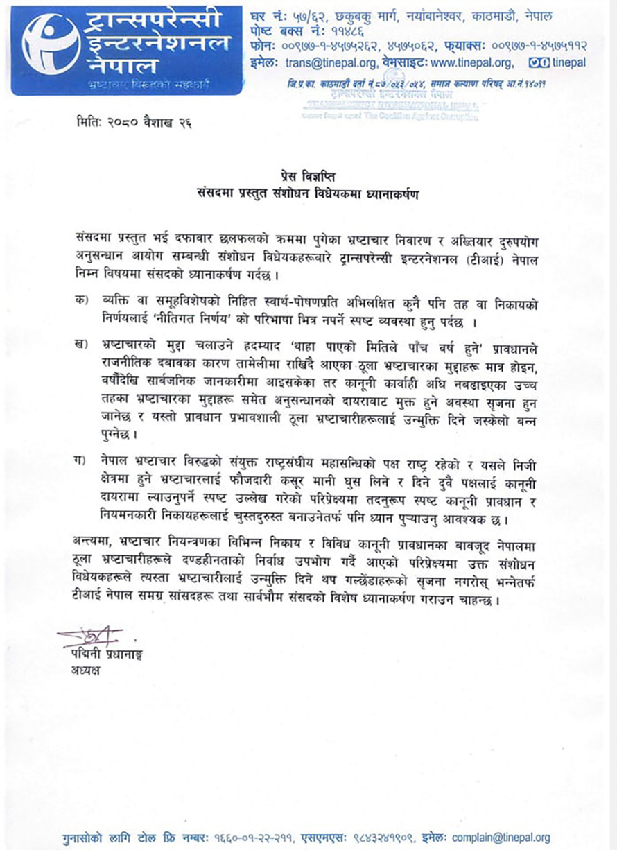 काठमाडौं २६ वैशाख । ट्रान्सपरेन्सी इन्टरनेशनल (टीआई) नेपालले भ्रष्टाचारमा पाँच वर्षे हदम्याद राख्ने प्रस्तावलाई प्रभावशाली ठूला भ्रष्टाचारीलाई उन्मुक्ति दिने जस्केलो भनी टिप्पणी गरेको छ । प्रतिनिधिसभामा दफावार छलफलका क्रममा रहेको भ्रष्टाचार निवारण र अख्तियार दुरुपयोग अनुसन्धान आयोग सम्बन्धी दुई वटा विधेयकमा भ्रष्टाचारमा पाँच वर्षे राख्ने ...