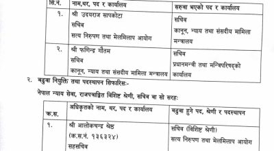 काठमाडौं । संक्रमणकालीन न्यायसम्बन्धी विधेयकमा दलहरूबीच सहमति जुटेको छ। दलहरूबीच कुरा नमिल्दा लामो समयदेखि कोपभाजनमा परेको संक्रमणकालीन न्यायसम्बन्धी विधेयक अन्तिम चरणमा पुगेको हो। सत्तारूढ नेपाली कांग्रेस, नेकपा (एमाले) र प्रमुख प्रतिपक्षी नेकपा (माओवादी केन्द्र) का नेताहरू सम्मिलित कार्यदलको बिहीबार बिहान गृह मन्त्रालयमा बसेको बैठकले विधेयकमा ...