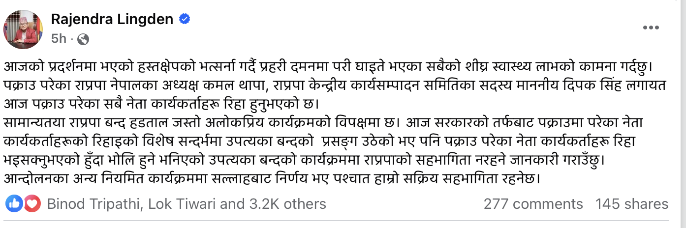 काठमाडौं १९ जेठ । राष्ट्रिय प्रजातन्त्र पार्टी (राप्रपा) का अध्यक्ष राजेन्द्र लिङ्देनले सोमबार राजावादी नवराज सुवेदीले गर्ने भनिएको उपत्यका बन्द कार्यक्रममा आफ्नो पार्टी सहभागी नहुने बताएका छन्। उनले आइतबार राति ११ बजेर ४९ मिनेटमा आफ्नो फेसबुकबाट बन्दमा सहभागी नहुन अपिल गरेका छन् । ‘सामान्यतया राप्रपा ...