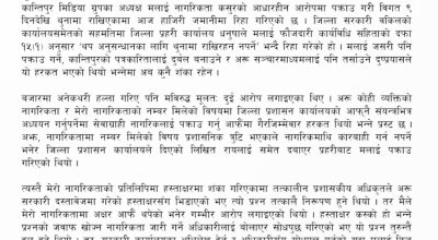 काठमान्डु जेठ १७ लाज हराएको समाज निर्माणको सारथी हुं म आउ छोरीहरु मेरो हातमा हत्कडी लगाउ। न्याय हराएको देश निर्माणको बिम्ब हुं म हिम्मत गर छोरीहरु मेरो लागि पिन्जडा बनाउ। मैले सिकाएको सिकाइले हिंसक बनेर मेरो छोराले तिमीलाई बलात्कार गर्दा ममताको पछ्यौरी ओडेर मैले समाजलाई ...