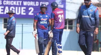 काठमाडौं, फागुन १० । क्यानडाविरुद्धको ३ खेलको एकदिवसीय सिरिजको अन्तिम खेलमा नेपाल ‘ए’ टीमले १८२ रनको लक्ष्य दिएको छ । मुलपानी क्रिकेट मैदानमा क्यानडाविरुद्ध टस हारेर पहिला ब्याटिङ गरेको नेपाल ‘ए’ टीम ४७ ओभरमा १८१ रनमा समेटिएको हो । नेपालका लागि अशुन्तोष घिरैयाले सर्वाधिक २८ ...