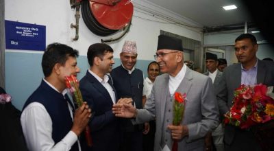 काठमाडौं ३१ असार । नवनियुक्त प्रधानमन्त्री केपी शर्मा ओलीसहित नेकपा एमालेबाट मन्त्री बनेकाहरू केन्द्रीय मुख्यालय च्यासल पुगेका छन् । पार्टी नेताहरू पुष्पलाल, मनमोहन अधिकारी र मदन भण्डारीको शालिकमा माल्यार्पण गर्न प्रधानमन्त्री ओली च्यासल पुगेका हुन् । प्रधानमन्त्रीसँगै मन्त्रीहरू पनि च्यासलमै छन् । माल्यार्पणपछि नेता–कार्यकर्ताबाट शुभकामना ...