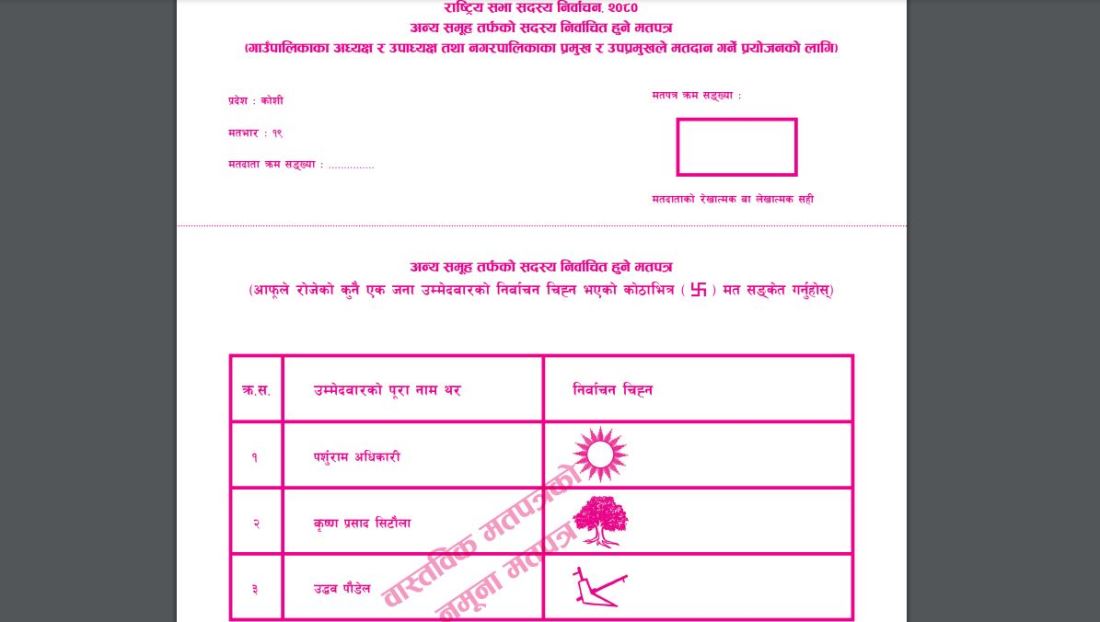 काठमाडौं ३ माघ । निर्वाचन आयोगले राष्ट्रियसभा निर्वाचनको नमुना मतपत्र सार्वजनिक गरेको छ । आयोगले वेबसाइटमा नमुना मतपत्र सार्वजनिक गरेको हो । नमुना मतपत्रमा उमेदवारहरूको नाम राखिएको छ । क्लष्टरहरूअनुसार छुट्टाछुट्टै मतपत्र छ । नमुना मतपत्रको रङ गुलाबी र निलो हरियो छ । आउँदो माघ ११ ...