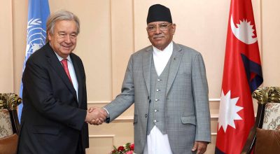 काठमाडौं, १२ कात्तिक । प्रधानमन्त्री पुष्पकमल दाहाल ‘प्रचण्ड’ले संयुक्त राष्ट्रसंघको विश्व शान्ति मिसनमा नेपाली सेना र प्रहरीले गरेको योगदानानुसारको सम्मान गर्न आग्रह गरेका छन् । आइतबार संयुक्त राष्ट्रसंघका महासचिव एन्टोनियो गुटेरेससँगको शिष्टाचार भेटमा प्रधानमन्त्री प्रचण्डले यस्तो आग्रह गरेका हुन् । चारदिने नेपाल भ्रमणको सिलसिलामा आइतबारै ...