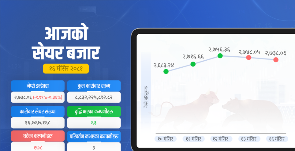 काठमाडौं १६ मंसिर । मौद्रिक नीतिको समीक्षापछि आइतबार सेयर बजार ९।९९ अंक घटेको छ । यो गिरावटसँगै बजारको परिसूचक नेप्से २७ ३८ मा कायम भएको छ । मौद्रिक नीतिको समीक्षामार्फत कुनै पनि नीतिगत व्यवस्था गरिएको थिएन । कारोबार रकम केही बढेको छ । कुल ८ ...