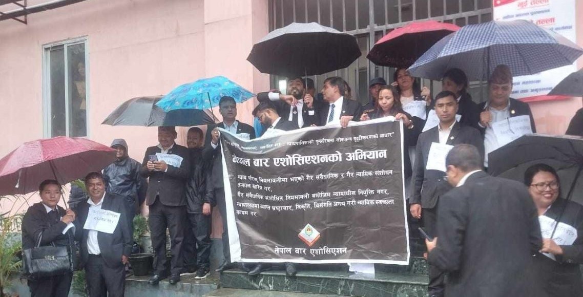 काठमाडौं ११ असोज । न्याय परिषद्को बैठकस्थलबाहिर नेपाल बार एसोसिएसनले धर्ना दिइरहेको छ। दर्के झरी परिरहेका बेला नेपाल बारको नेतृत्वमा गएका कानुन व्यवसायीहरू छाता ओढेर धर्ना दिइरहेका छन्। तत्काल न्यायाधीश नियुक्त गर्न नहुने नेपाल बारको माग छ। न्याय परिषद्ले गत वर्ष गरेको न्याय परिषद् नियमावली ...