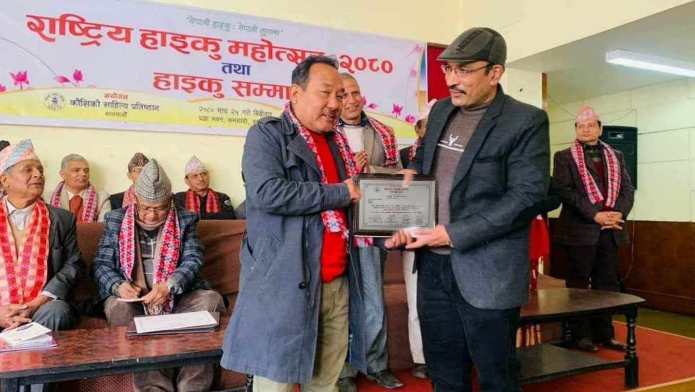 काठमाडौं, २९ माघ । नेपालका सम्पूर्ण हाइकु कविहरूको साझा सङ्गठन “नेपाल हाइकु सङ्घ” केन्द्रीय समितिले “नेपाली हाइकु नेपाली सुगन्ध भन्ने नारासहित ”राष्ट्रिय हाइकु महोत्सव(२०८०” तथा हाइकु सम्मानको आयोजना गरेको छ । महोत्सवका प्रमुख अतिथि नेपाल प्रज्ञा-प्रतिष्ठानका कुलपति भूपाल राईले ब्यानर वाचन गर्दै निबन्धकार शङ्कर लामिछानेद्वारा ...